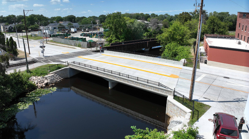 The new West Division Street Bridge also vastly improves the neighborhood aesthetic. Located within a former industrial area, the bridge is surrounded with beautiful old brick warehouses that are being repurposed and tastefully redeveloped. The bridge project incorporates decorative railings and form-lined concrete surfaces to replicate a natural stone finish similar to other bridges in the city. It also utilizes cut-stone boulders for streambank stabilization along the river’s banks, a modern aesthetic that ties nicely into the brick/block style of the surrounding architecture.